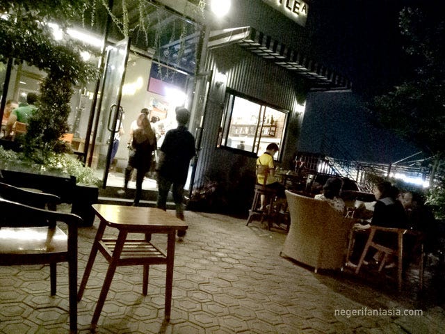 Karena semua meja di lantai 2 sudah terisi, akhirnya kami memilih meja yang terletak di teras coffee shop.