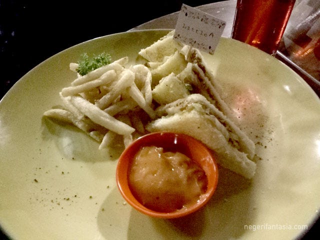 Kami pun memesan Tuna Sandwich dan Fish n’ Chip. Untuk minuman kami mencoba Violetta dan Purple Love.